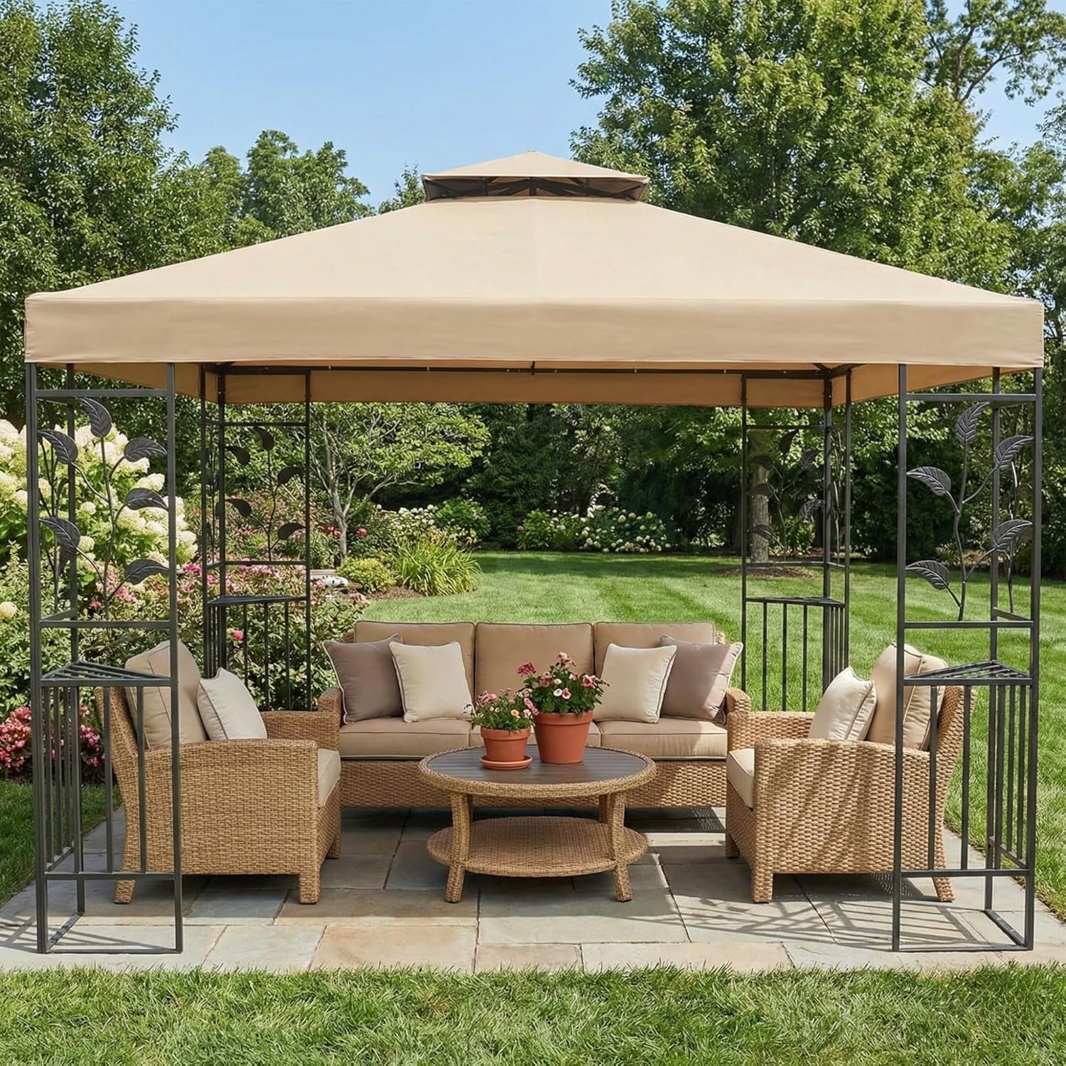 Replacement canopy top compatible with Aldi Leaf 10' x 10' Gazebo models 7884-15 and 7884 (2015-2016) sold at Aldi and various retailers. Made from 350 denier polyester in Beige, the fabric is UPF 50+ UV Resistant, water resistant, and CPAI-84 fire retardant for outdoor use. Backed by a 1-year limited performance warranty with US-based customer support for fit and product questions. Replacement canopy only; metal frame and mosquito netting not included.