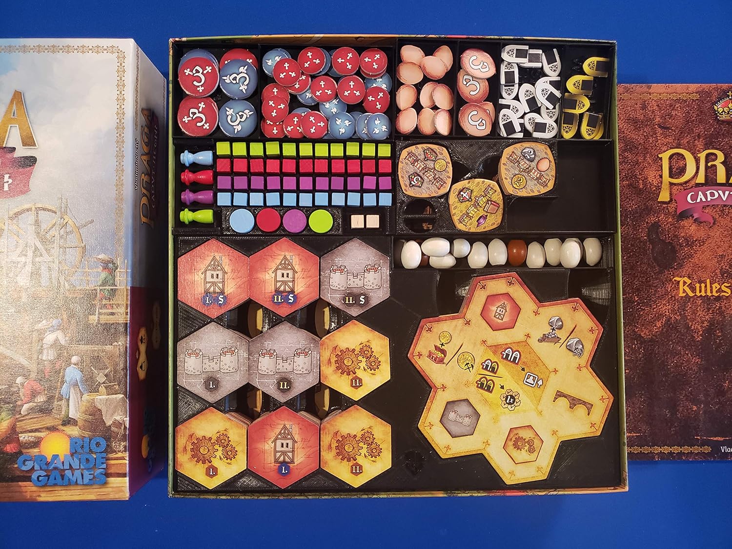 This is an insert set for the great new game Praga Caput Regni! This game has an absolutely beastly amount of components and is quite overwhelming to setup and tear down. This insert set helps to make this game much more manageable and gives it a more polished presentation! No longer will you need to open and empty a dozen plastic baggies. -Many pieces can be used during gameplay, making setup and tear-down MUCH quicker! -All components (including the 3d components) have their own locations, many labeled to make packing this game up very easy! -The game can be stored in either direction and no components will lose their place. -This is made from environmentally friendly 3d printed PLA plastic. This was lovingly designed by myself If you have any questions please let me know!